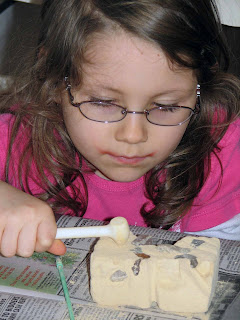 We let the mummy dry overnight. The next day she drew a design and started painting. She still has more painting to do before her mummy is complete. I'll post pictures when it's finished.